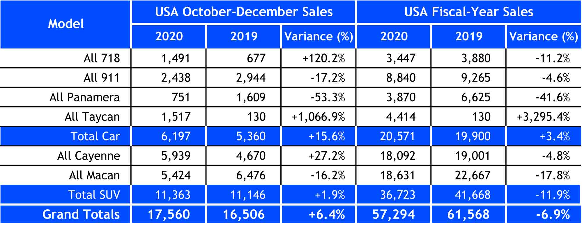 Porsche USA 2020 sales: Seen here is a chart of a spreadsheet depicting the quantitative numbers of Porsche USA sales for Q4 2020 and Fiscal-Year 2020 as described in the accompanying article. Source: Porsche Cars North America
