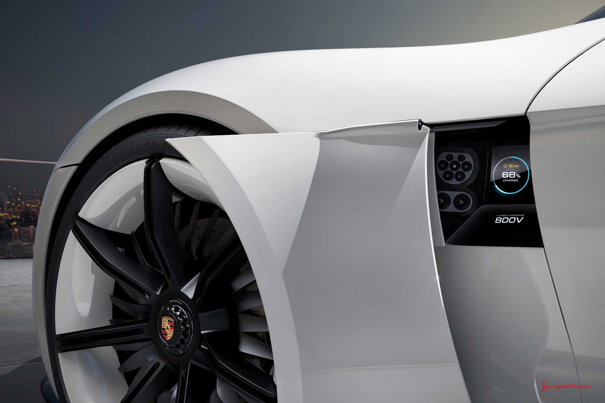A moveable body segment on the front left wing in front of the driver’s door gives access to the charging port for the innovative “Porsche Turbo Charging” system. Via the 800-volt port, the battery can be charged to approximately 80 per cent of its capacity in around 15 minutes — a record time for electric vehicles.