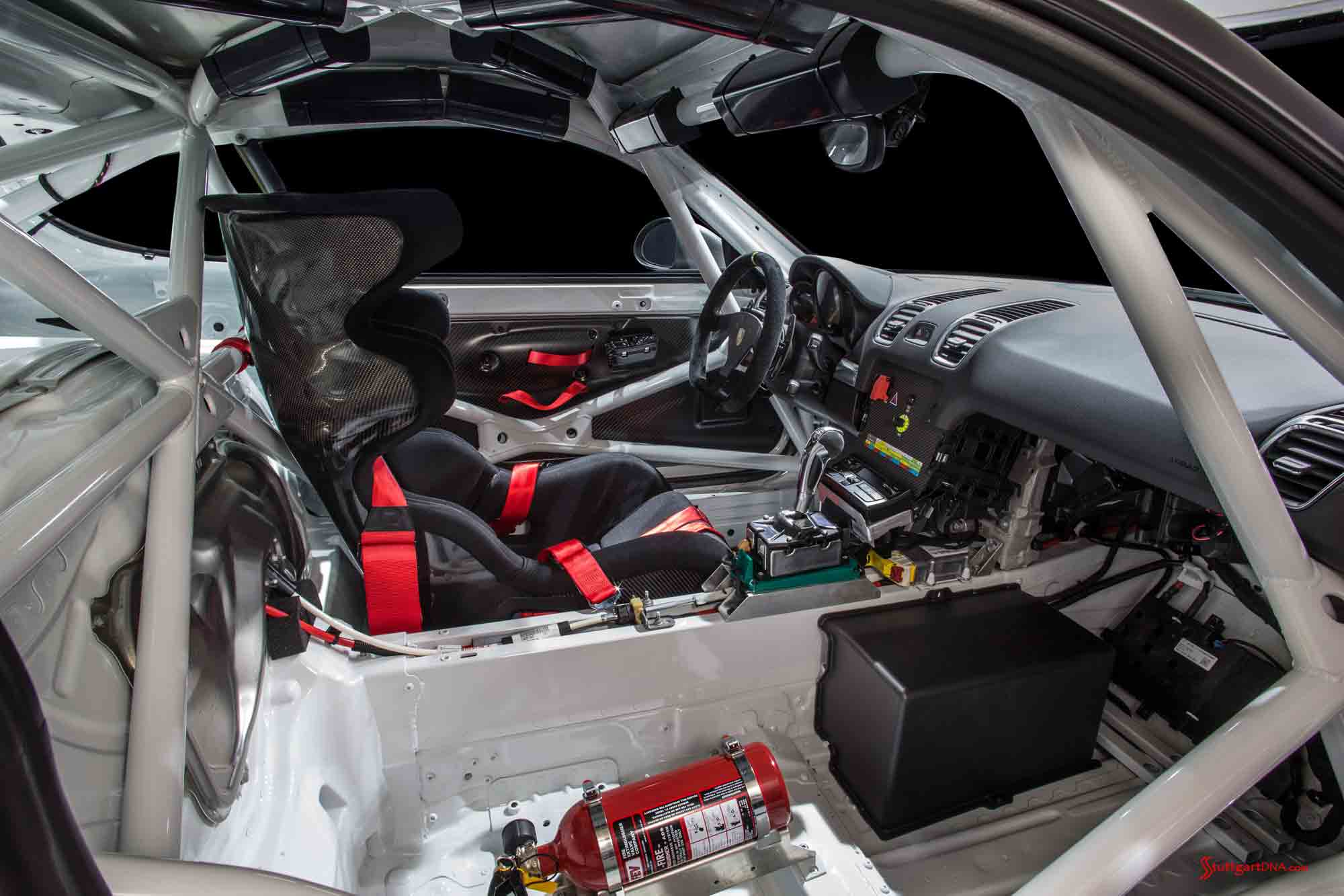 The impressive racing brake system is fitted with steel brake discs all round measuring 15-inch (380-millimeters) in diameter. Tipping the scales at just 2,866 lbs. (1,300 kilograms), the Cayman GT4 Clubsport, delivered from the factory with a welded-in safety cage, a racing bucket seat as well as a six-point harness, is truly lightweight.