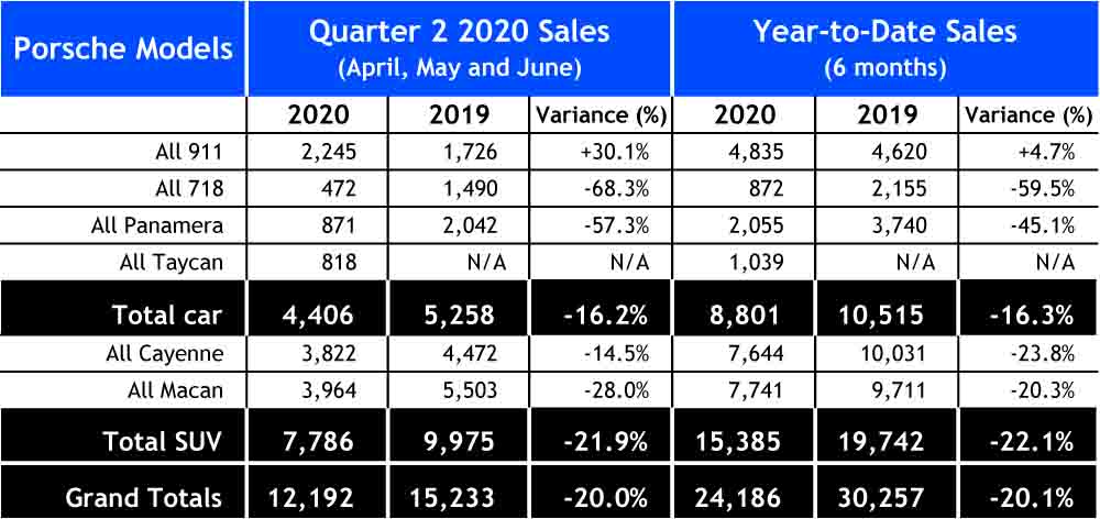 Porsche second-quarter 2020 USA retail sales figures exhibited lingering effects of the COVID-19 scourge. Porsche Cars North America (PCNA) reported these numbers recently. PCNA encompasses 192 independently owned and operated dealerships serving Porsche customers across the country.