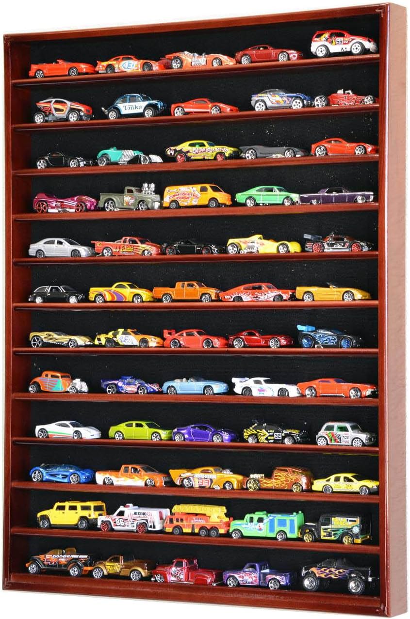 The 60-model-car display case is hand-constructed from imported wood. It serves as an excellent way to proudly display all of your Hot Wheels and Matchbox model cars.