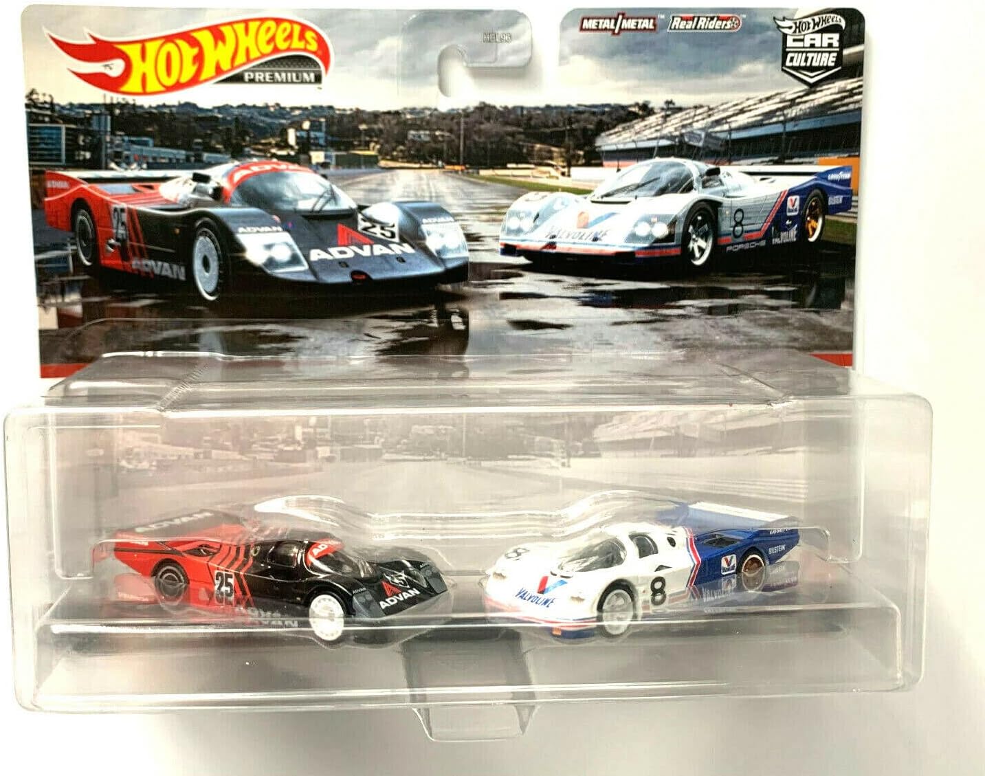 This Hot Wheels Advan and Valvoline Porsche 962s Car Culture Real Riders Premium Double Pack is available as a 1:64-scale diecast model for your child to play with or for your collection.