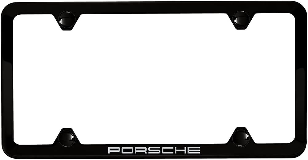 The “Porsche” Slimline License Plate Holder in Black is a Porsche Genuine frame. This discrete license frame features four universal mounting holes for simple installation.