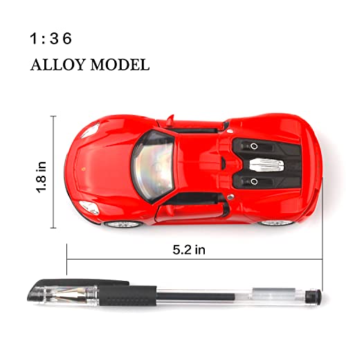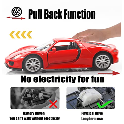 The TOKAXI 1:36-Scale Red Porsche 918 Spyder Diecast Model Car, with Pull-Back Feature, is made of zinc alloy, plastic parts and rubber tires. This makes it safer for children to play with the Porsche 918 Spyder.