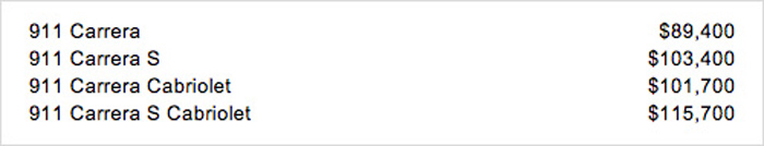 The new Porsche 911 Carrera models will be launched in the United States in March of 2016. Manufacturer’s suggested retail prices start as follows: